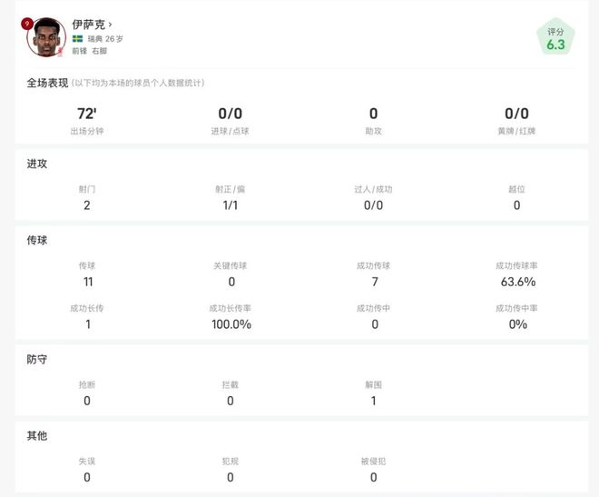 另外有1次成功长传,以及1次解围。