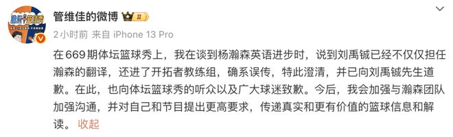 全文如下:在669期体坛篮球秀上,我在谈到杨瀚森英语进步时,说到刘禹铖已经不仅仅担任瀚森的翻译,还进了开拓者教练组,确系误传,特此澄清,并已向刘禹铖先生道歉。在此,也向体坛篮球秀的听众以及广大球迷致歉。今后,我会加强与瀚森团队加强沟通,并对自己和节目提出更高要求,传递真实和更有价值的篮球信息和解读。